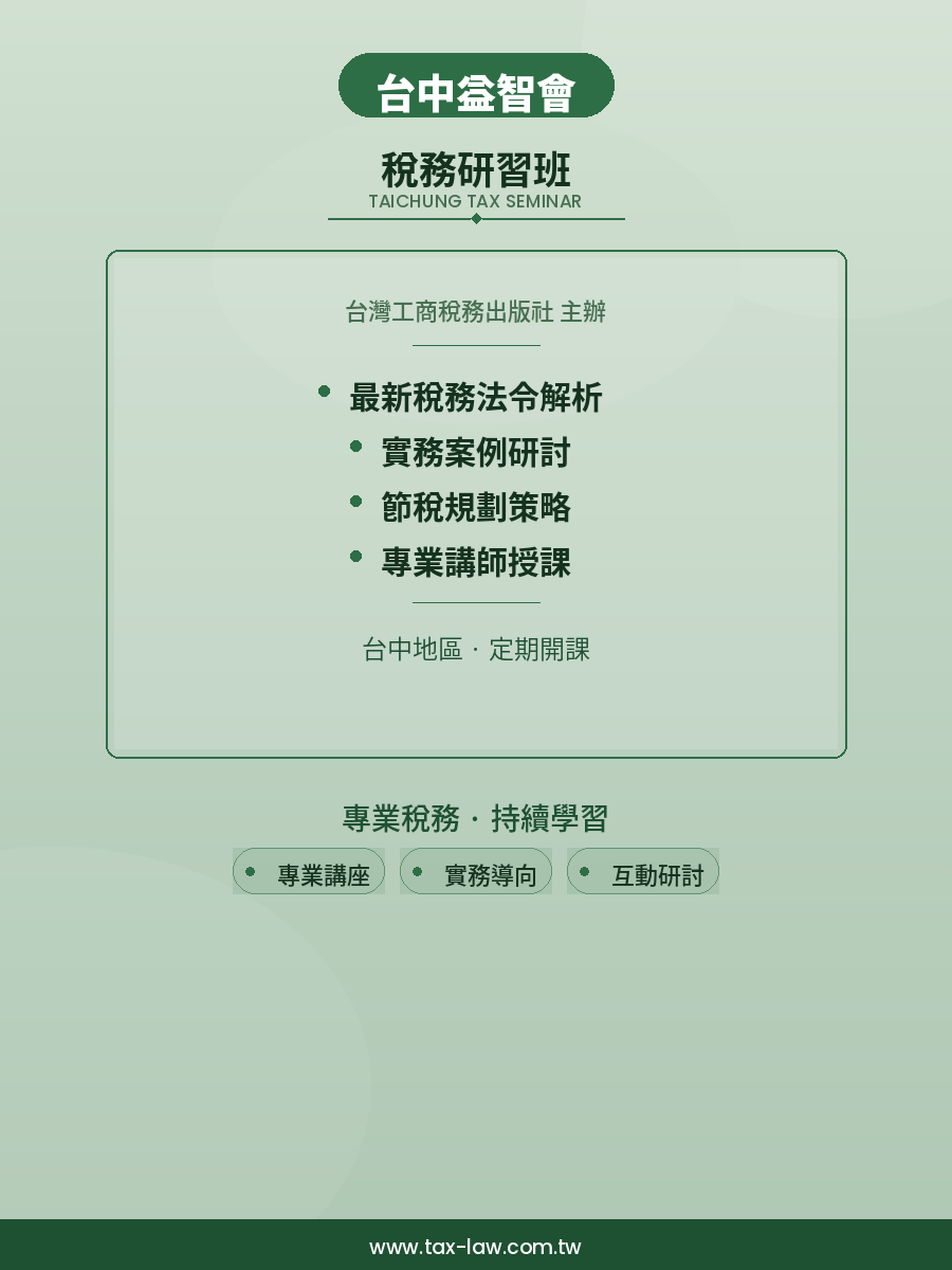 上課城市:台中 研習時數:40 主辦單位:臺灣工商稅務出版社